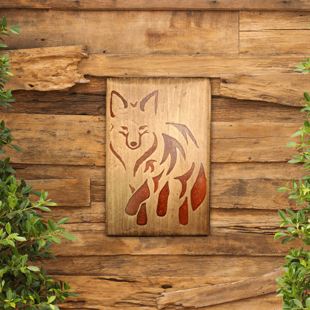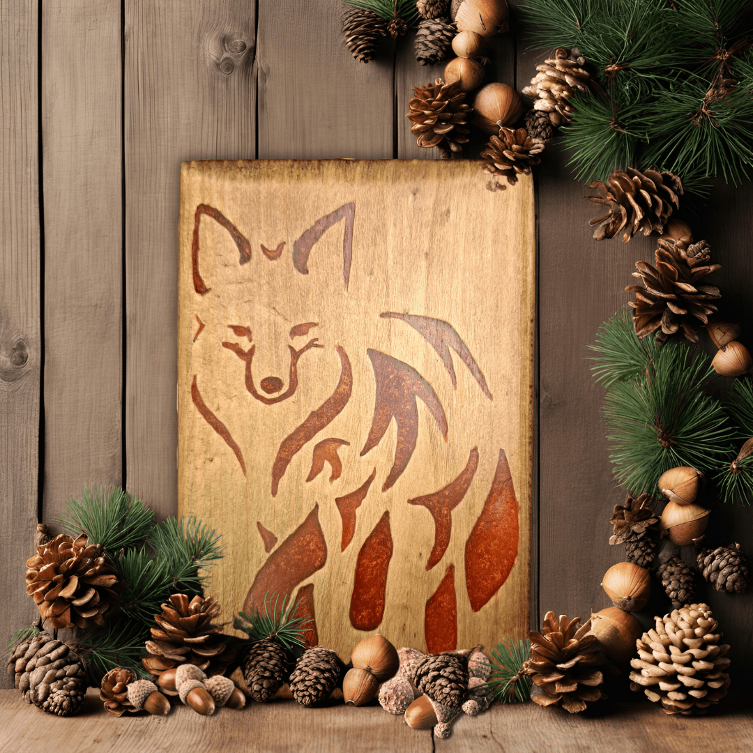 Hand-carved from repurposed pine wood, this piece features a fox highlights design inlaid with a vibrant resin, infused with orange and gold mica powder for a captivating, swirling effect. The result is a striking contrast between the natural wood and the shimmering inlay, capturing the essence of a fox’s graceful and mysterious spirit.