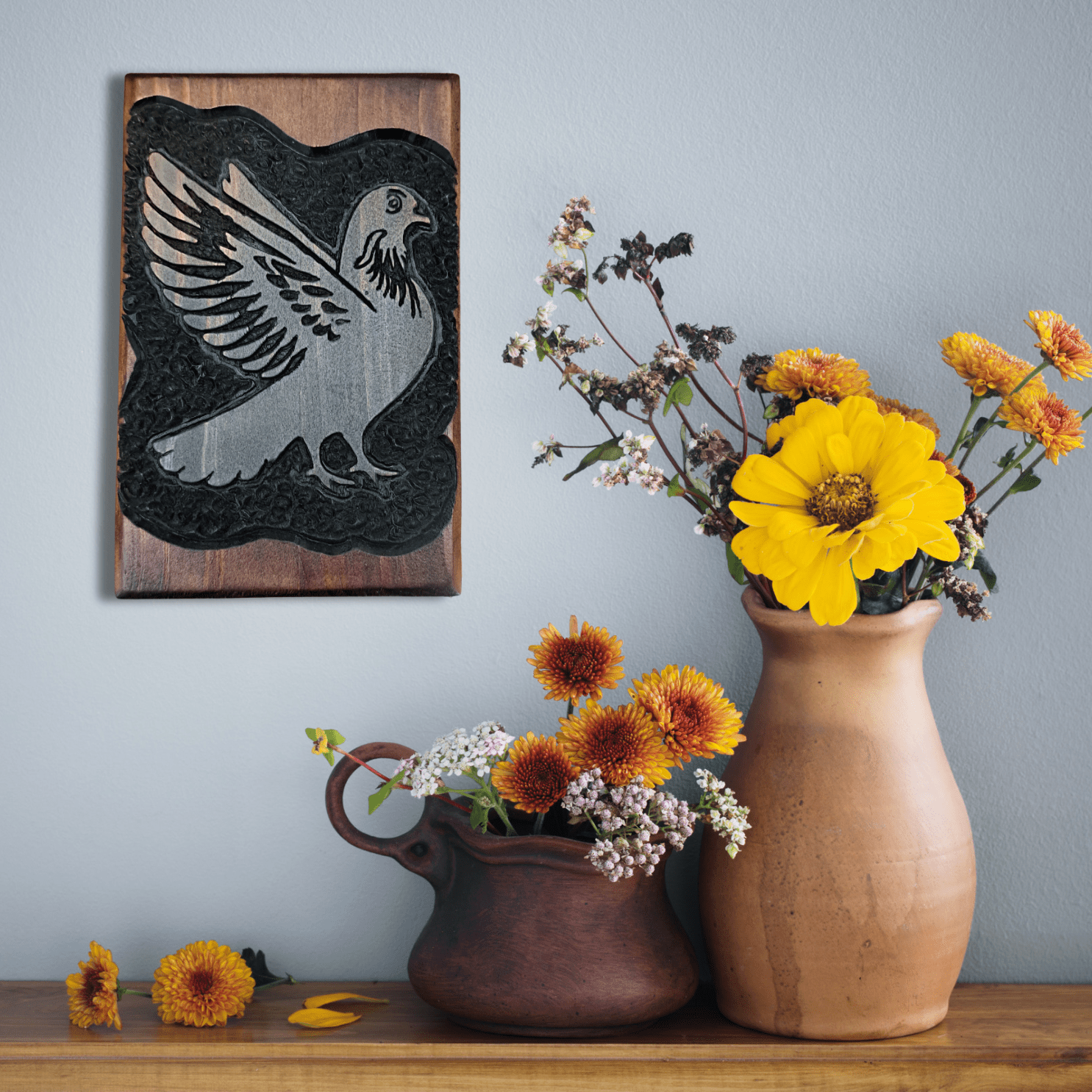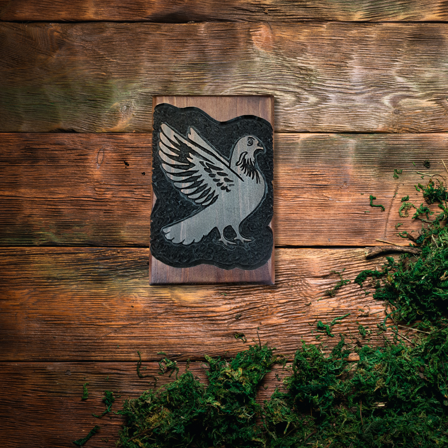 This handcarved wooden artwork offers a unique perspective on the often misunderstood pigeon. Crafted from reclaimed wood, the piece showcases the bird’s graceful form and subtle beauty.