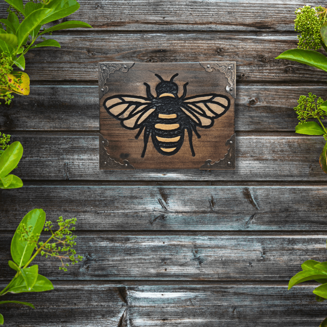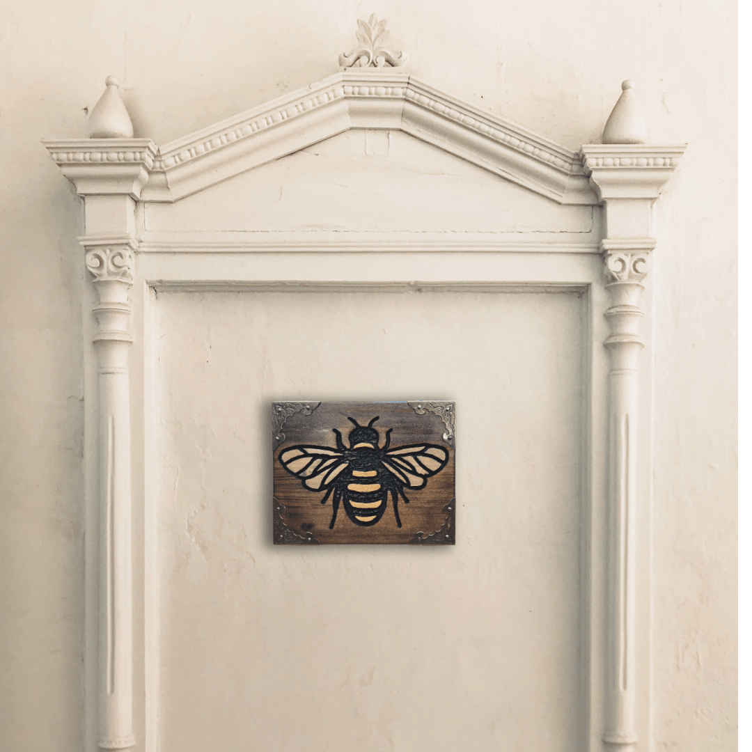 Add a touch of charm to your home decor with this striking wood carving of a bee. Carved into reclaimed wood, the design captures the distinctive form of nature’s hardworking pollinator. The bee’s body, wings, and legs are brought to life with textured details against the warm, earthy backdrop of the wood. Decorative metalwork corners provide an elegant, vintage framing accent.